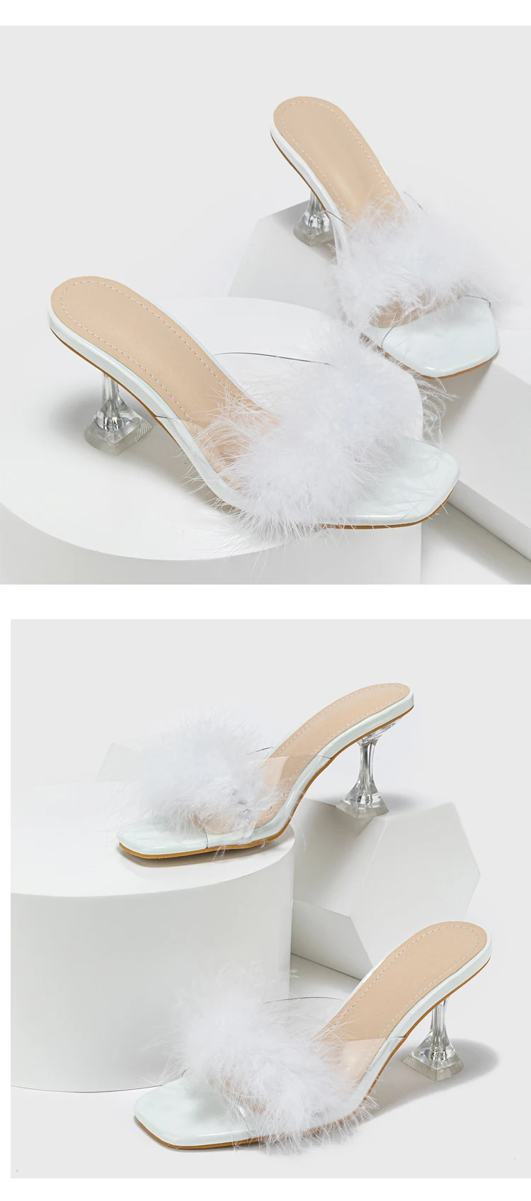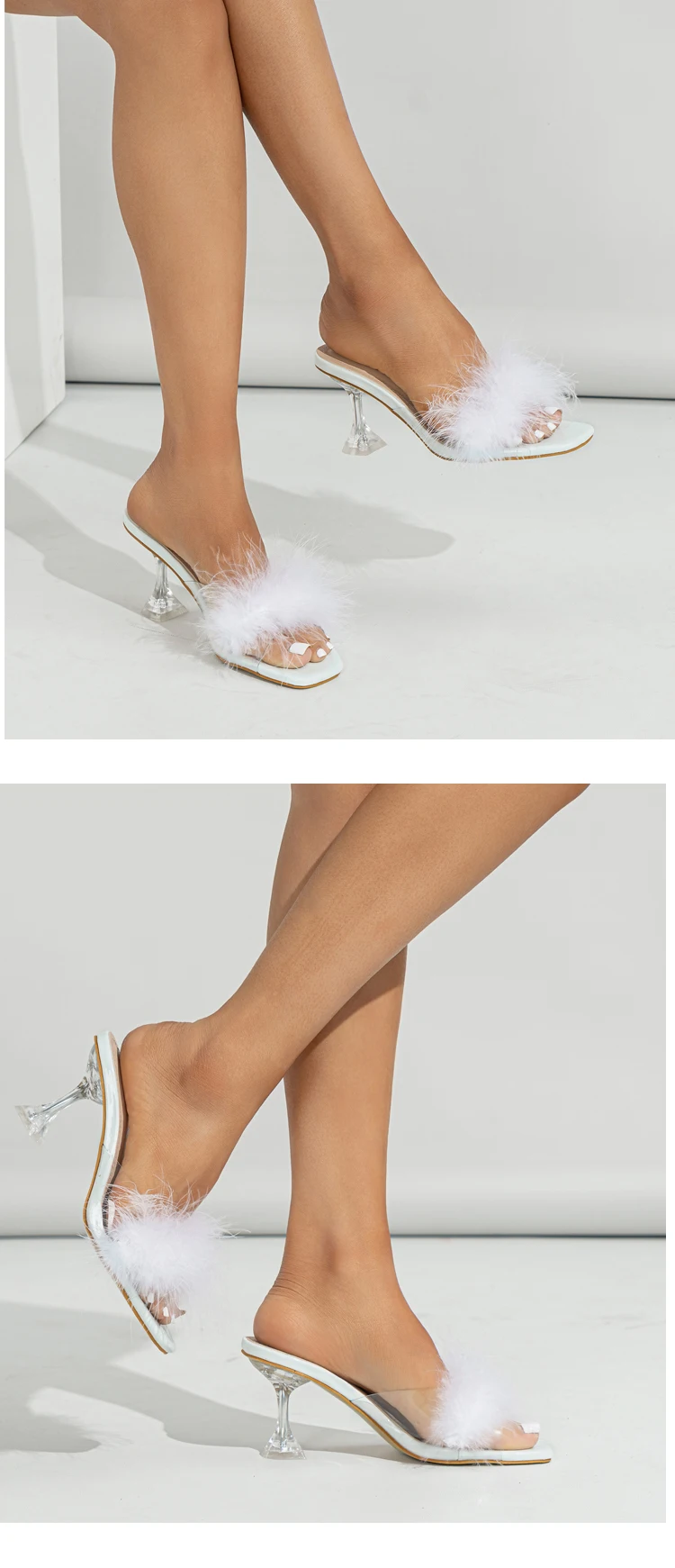 Aneikeh Elegant Sexy Feather Decorative Sandals Slippers Women's Square Head Open Toe PVC Transparent Kitten Heel High Heels