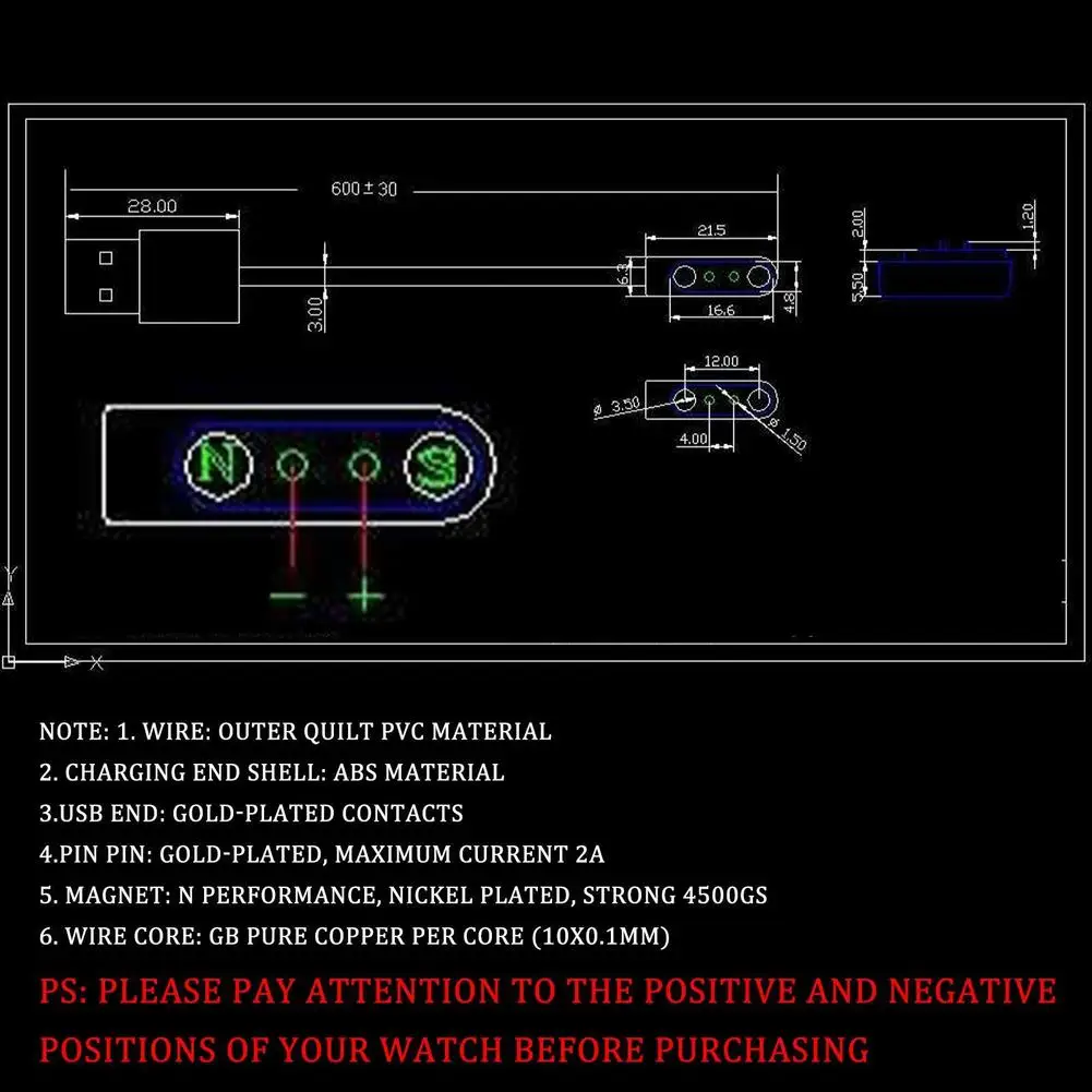 Magnetic Charge Charging Cable For Smart Watch For 2 Pins 2.84/4/7.62mm Distances Black Novel USB Power Charger Cables Universal