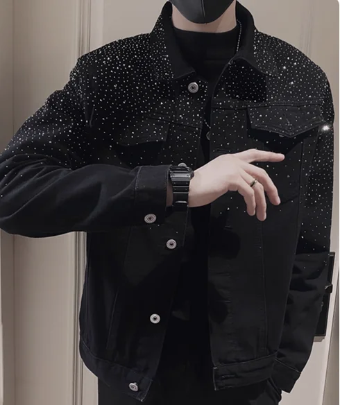 Men's Lapel Loose Version Versatile Shoulder Padded Jacket Casual Handsome Long Sleeve Chic Denim Top Hot Diamond Denim Jackets