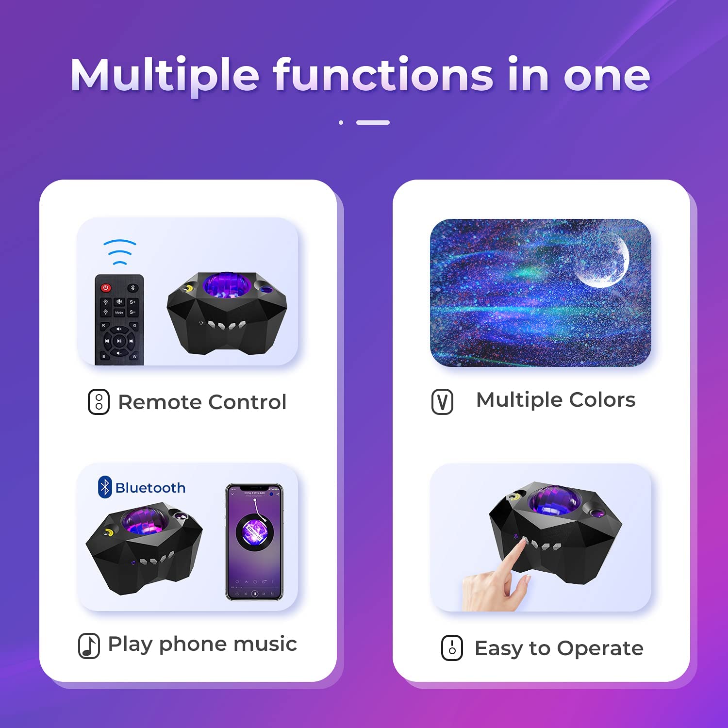 Works with smartphones via Bluetooth,play local music through mobile phone, then you’ll see the light will change color with themusic beats.resulting in a starry sky projection.Voice Control(Only control the lights speed).